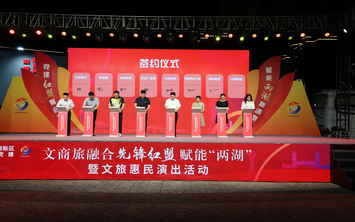 9月13日晚,“黨建紅盟聚合力、賦能兩湖新消費(fèi)”文商旅融合先鋒紅盟賦能“兩湖”暨文旅惠民演出活動(dòng)在藍(lán)海豚文化藝術(shù)街區(qū)成功舉行。市級(jí)機(jī)關(guān)工委書記趙天晟,副書記潘奕,市文廣旅局黨組書記、局長(zhǎng)嚴(yán)俊,市商務(wù)局黨組書記、局長(zhǎng)韓雪琴,市黨史工委主任柯善學(xué)等領(lǐng)導(dǎo)出席活動(dòng);金壇、武進(jìn)、鐘樓區(qū)文旅(體育)、商務(wù)、黨史部門領(lǐng)導(dǎo)及恐龍園、江南銀行、常州移動(dòng)等紅盟單位重點(diǎn)企業(yè)領(lǐng)導(dǎo)參加活動(dòng)。集團(tuán)公司黨委書記、總經(jīng)理朱平春、副總經(jīng)理黃細(xì)富等領(lǐng)導(dǎo)及街區(qū)商管公司相關(guān)人員參加活動(dòng)。