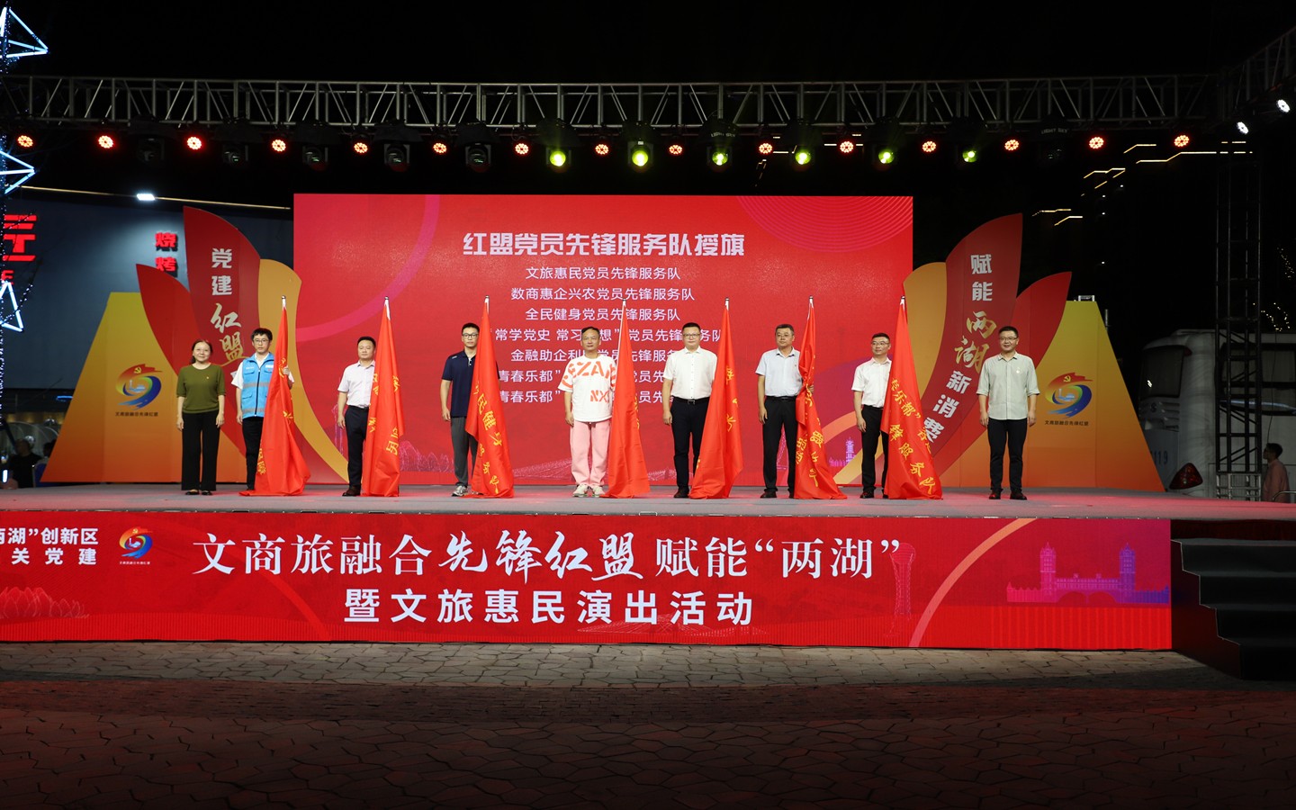 活動(dòng)現(xiàn)場(chǎng),集團(tuán)機(jī)關(guān)黨支部作為“紅盟助力街區(qū)夜消費(fèi)”重點(diǎn)項(xiàng)目黨支部參加共建簽約,成立的“青春樂(lè)都”客運(yùn)保障黨員先鋒服務(wù)隊(duì)參加了現(xiàn)場(chǎng)授旗儀式?,F(xiàn)場(chǎng)還發(fā)布了《“兩湖”創(chuàng)新區(qū)文商旅融合先鋒紅盟行動(dòng)方案》以及“兩湖”創(chuàng)新區(qū)夜間文商旅消費(fèi)集聚區(qū)典型案例,集團(tuán)轉(zhuǎn)型開發(fā)項(xiàng)目——藍(lán)海豚文化藝術(shù)街區(qū)上榜。