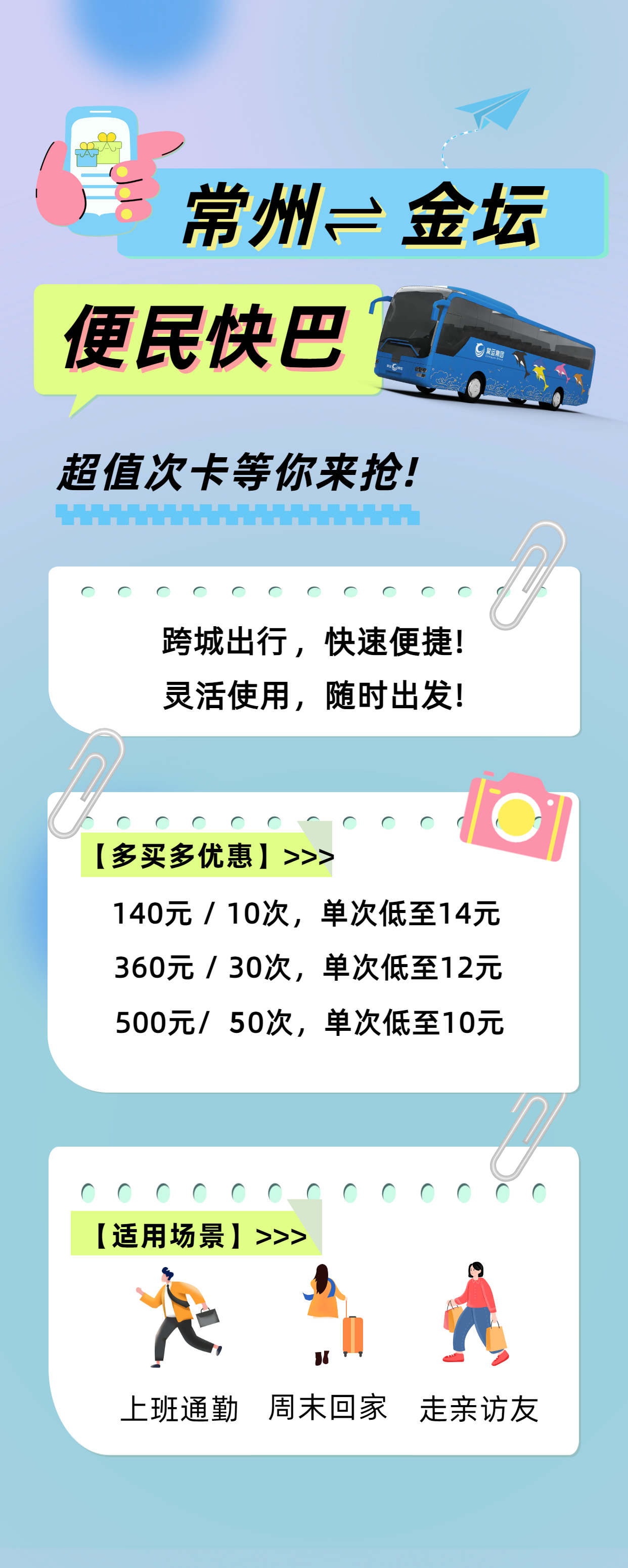 為進(jìn)一步提升出行體驗(yàn),常州至金壇便民快巴近日推出超值次卡,為廣大市民提供更加優(yōu)惠、便捷的出行選擇。此次推出的次卡共分為三檔:140元10次、360元30次、500元50次,具體購買及使用方式可關(guān)注“常州汽車站”公眾號了解詳情。